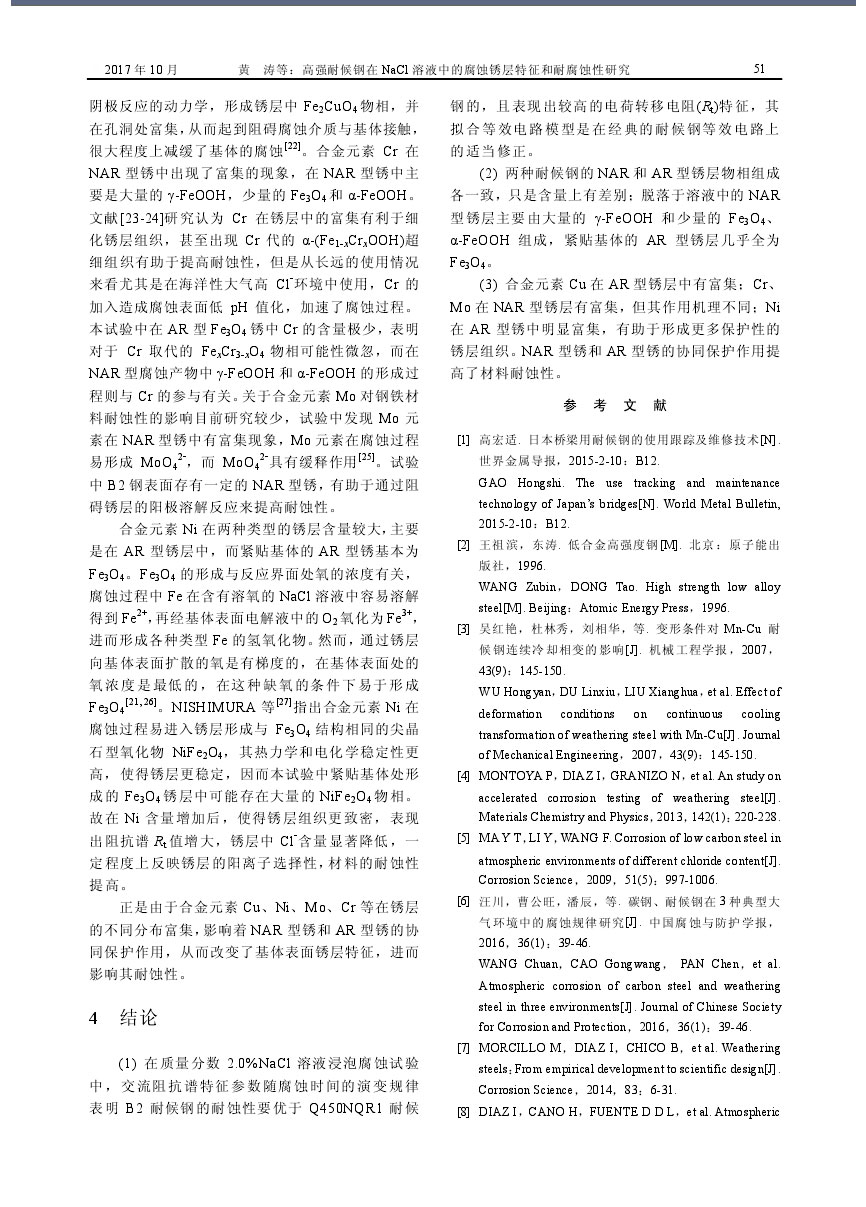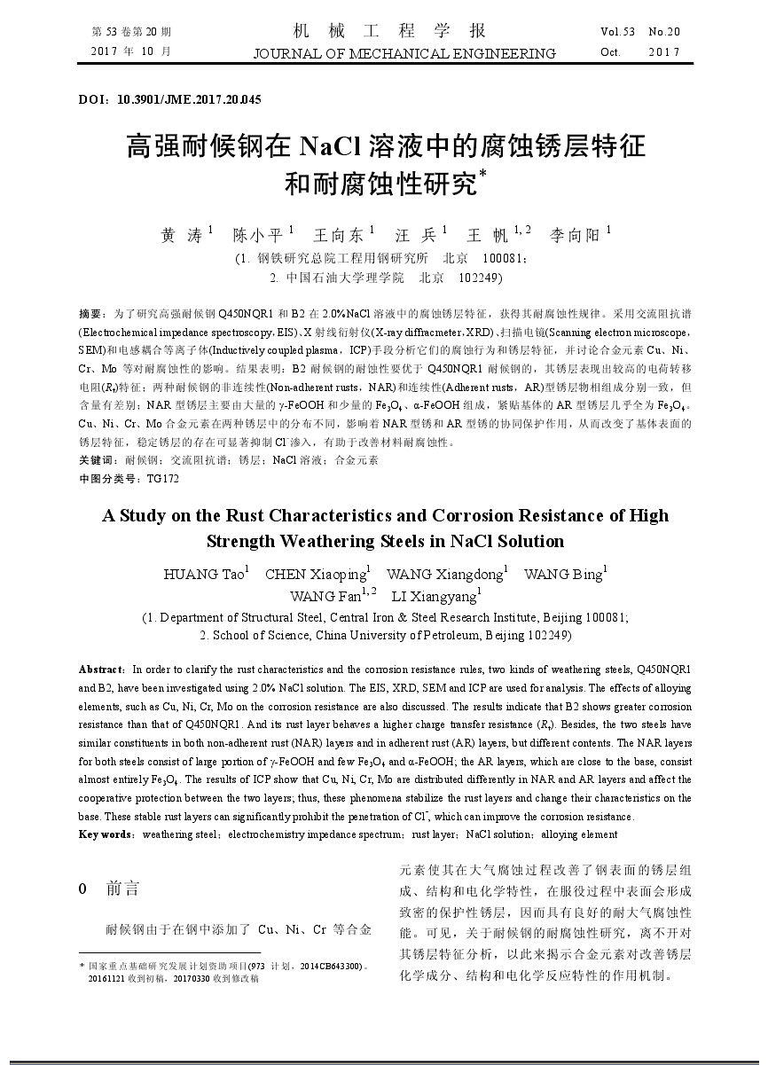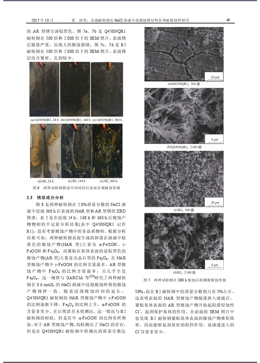 高強耐候鋼在NaCl溶液中的腐蝕銹層特征和耐腐蝕性研究