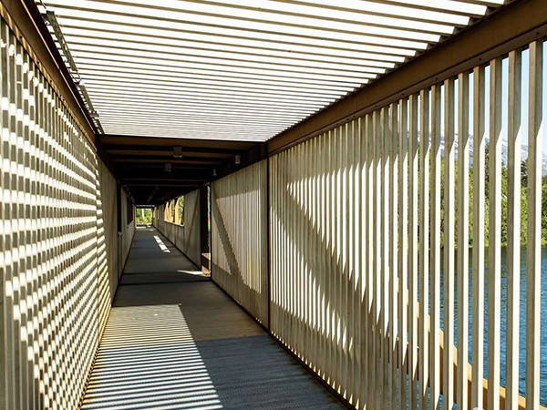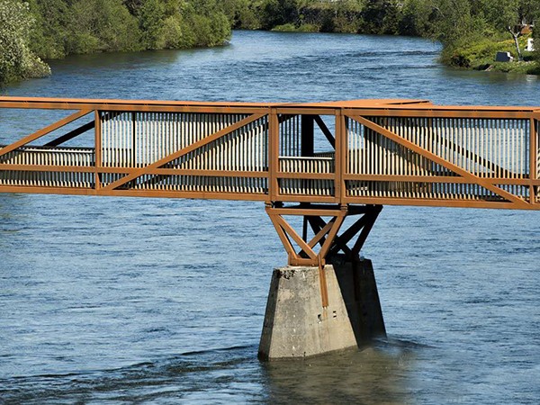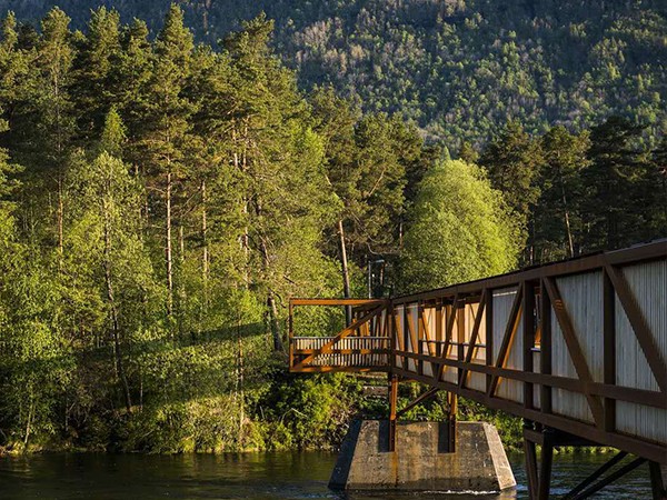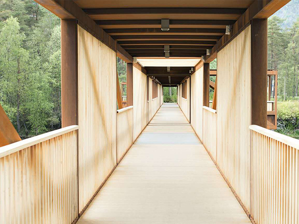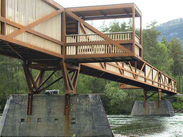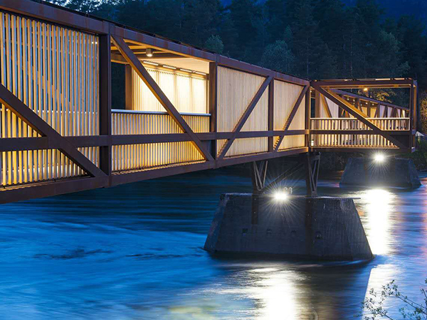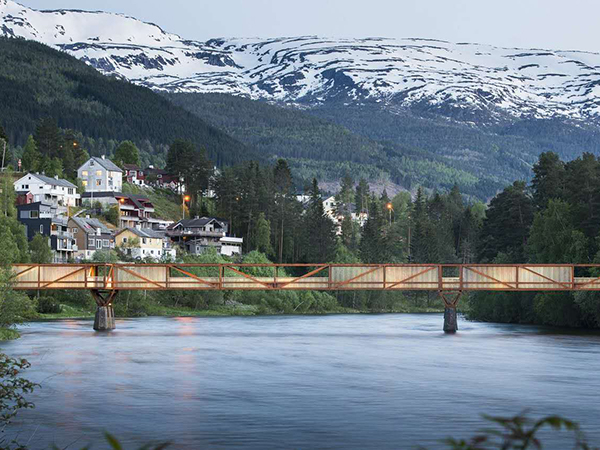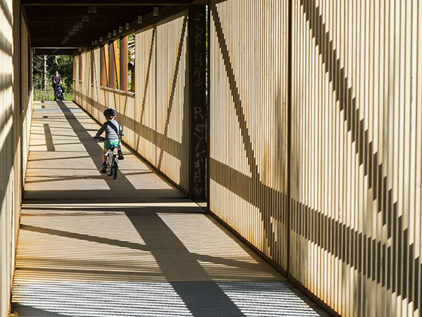 這座橋旨在取代前一年被洪水破壞的舊橋。新橋梁的設計嘗試用模數的節奏變化來跨越這條河流,從而打破間隔,同時解決過河時的單調。這一模數的變化是以舊橋現存墩柱的距離為基準的。將考登鋼作為結構材料,改性木材作為飾面,這種材料搭配整合了強度、耐久性與數年零維護的優點。