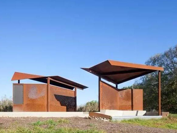 景觀中的銹鋼板被稱為耐候鋼,在普通鋼材中添加磷、銅、鉻、鎳等微量元素后,鋼材表面形成了附著力較強的致密和保護膜,阻礙了銹蝕的擴散發展,保護了銹層下方的基體,減緩其腐蝕速度。